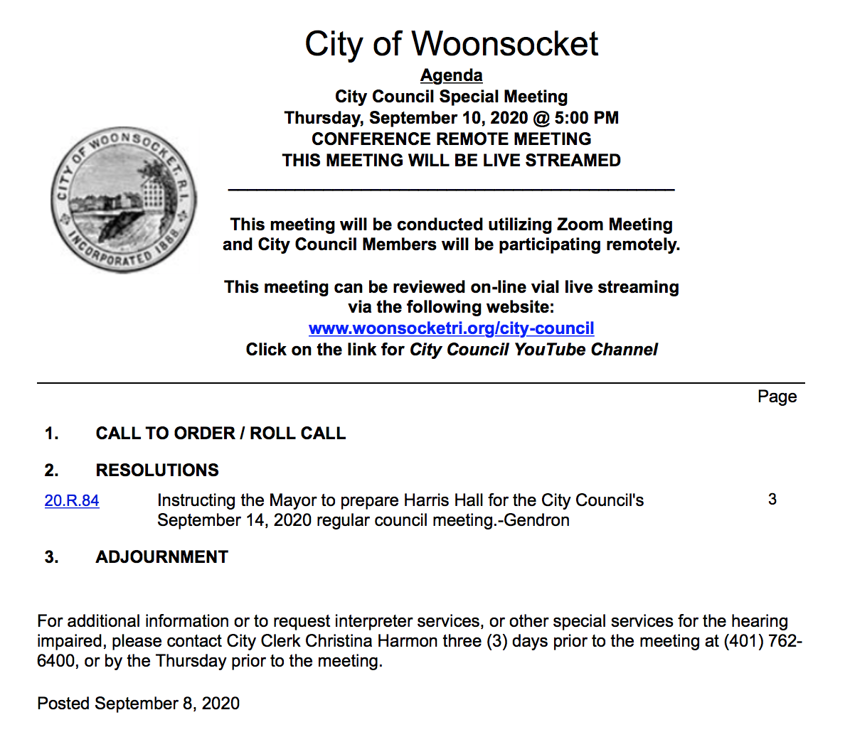 City of Woonsocket City Council Special Meeting Agenda for September 10th