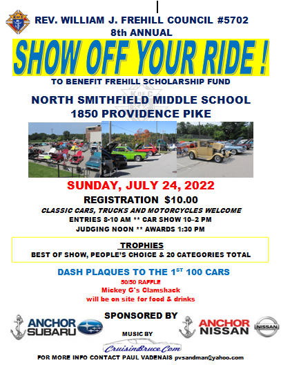 Frehill Council #5702 Knights of Columbus will sponsor its’ 8th annual Show Off Your Ride! car show on Sunday, July 24, at the North Smithfield Middle School. The school is located at the intersection of Greenville Road and Providence Pike. Once again, Anchor Subaru and Nissan have returned as the main sponsor with many local businesses sponsoring trophies and dash plaques to be awarded. A 50/50 raffle will be held.