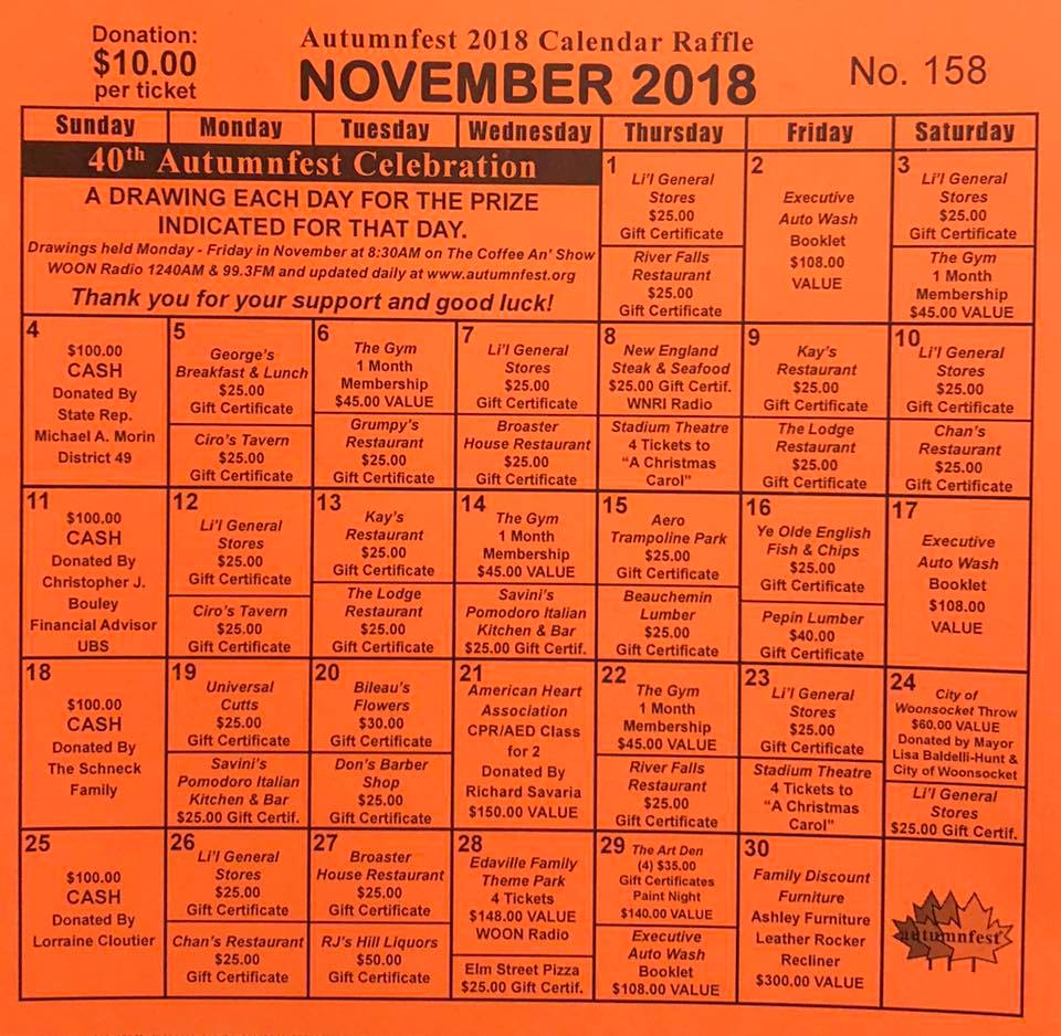 The Autumnfest Prize-A-Day Calendar drawings will take place every weekday in November on