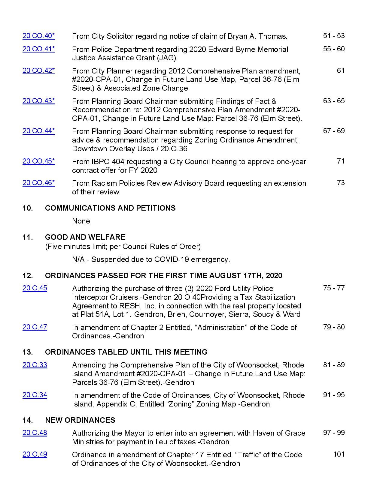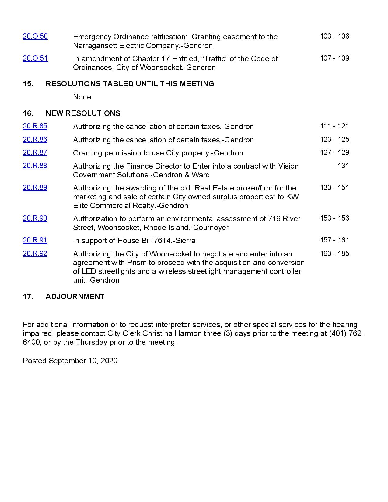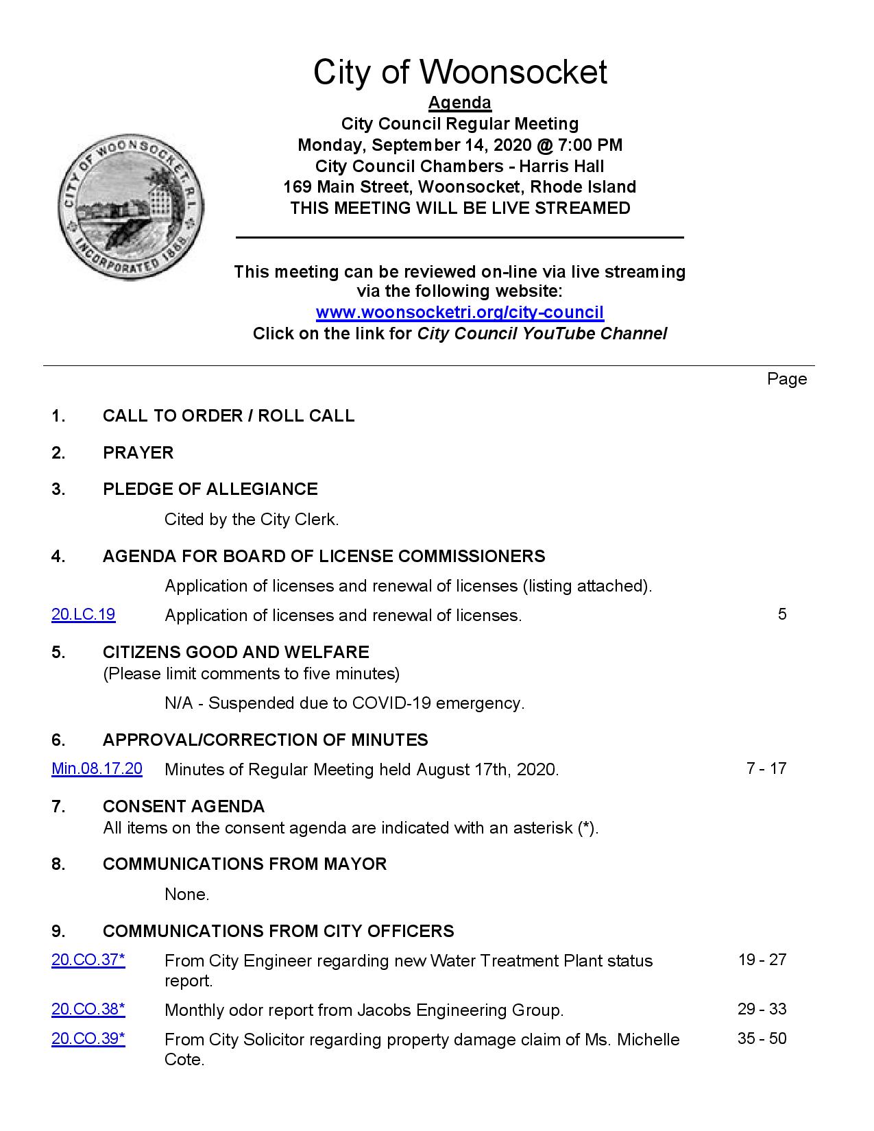 City of Woonsocket City Council Regular Meeting Agenda for Monday, September 14th