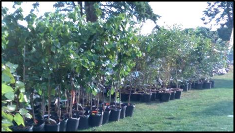 Energy Saving Tree saplings in three-gallon pots. Under the right conditions, mature trees will grow