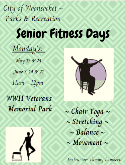 - Every Monday: (Starting May 17th - June 21st): @ 11am ~ WWII Veterans Memorial Park we have our Senior Fitness Days with chair yoga, stretch, balance and movement. (we will NOT meet 5/31)
