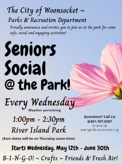 - Every Wednesday: (Starting May 12th through June 30th) @ 1pm ~ River Island Park we have our Seniors Social Events! Bingo, crafts, activities and more!