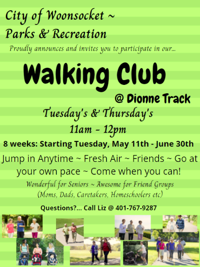 - Every Tuesday & Thursday: (Starting May 11th through July 1st) @ 11am ~ Dionne Track we have our Walking Club! Walk at your own pace, come when you can, stay as little or as long as you’ re comfortable!