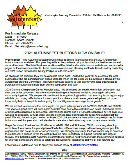 ........ Autumnfest button numbers have been drawn...1st prize $500 button 261 has been claimed by Patricia Martin, 2nd prize $250 button 3422, 3rd prize $100 button 7213if you hold one of those buttons, call 401-769-6925 to redeem ..Also, Congratulations to Robert Laplante of Woonsocket who won the Autumnfest Split-The-Pot drawing this year. Even with only one full day of play, Robert will receive $307.50 as his share of the Pot......