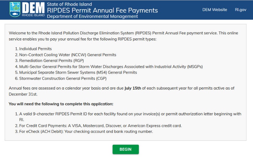 PROVIDENCE – The Department of Environmental Management (DEM) announces that annual fees for RI Pollution Discharge Elimination System (RIPDES) permits can now be paid online.