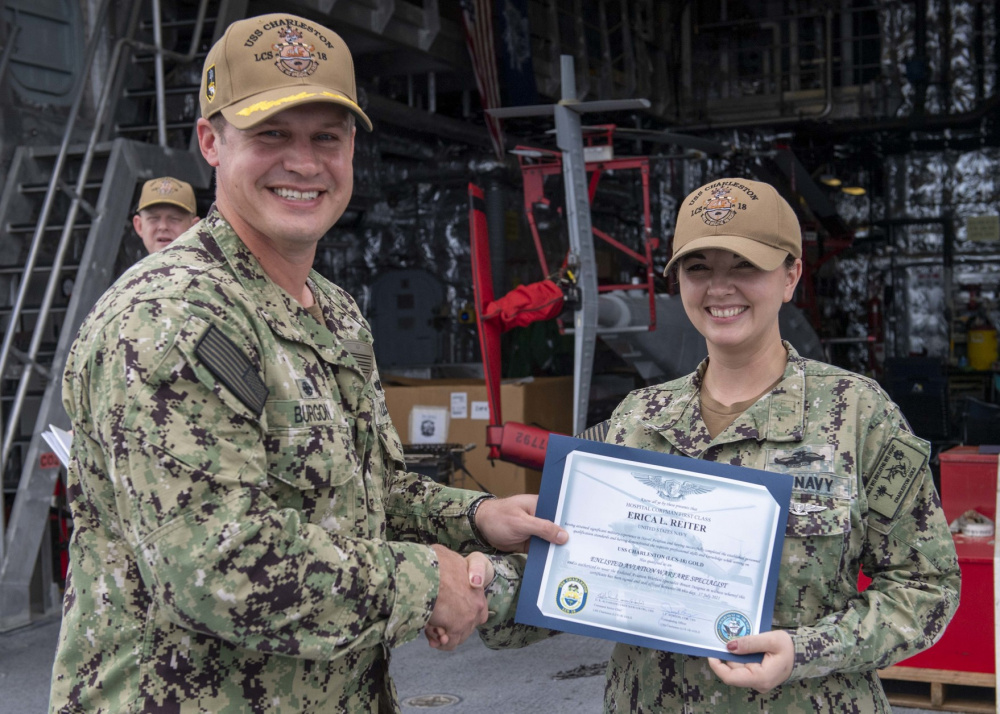 PHILIPPINE SEA (July 19, 2021) Hospital Corpsman 1st Class Erica Reiter, right, from North Smithfield, R.I., receives the Navy and Marine Corps Commendation Medal from Cmdr. Joseph Burgon, from Cottonwood, Calif., aboard Independence-variant littoral combat ship USS Charleston (LCS 18), July 19. Charleston, part of Destroyer Squadron Seven, is on a rotational deployment, operating in the U.S. 7th fleet area of operations to enhance interoperability with partners and serve as a ready-response force in support of a free and open Indo-Pacific region. (U.S. Navy photo by Mass Communication Specialist 2nd Class Adam Butler)