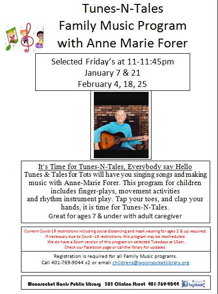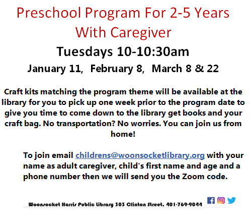 Due to current Covid regulations these programs are for ages 2 and up who can wear masks. It is possible that regulations may change from in-person to Zoom. Keep up to date by checking our Facebook, Twitter, and Instagram. Or call the library at 401-769-9044 x2