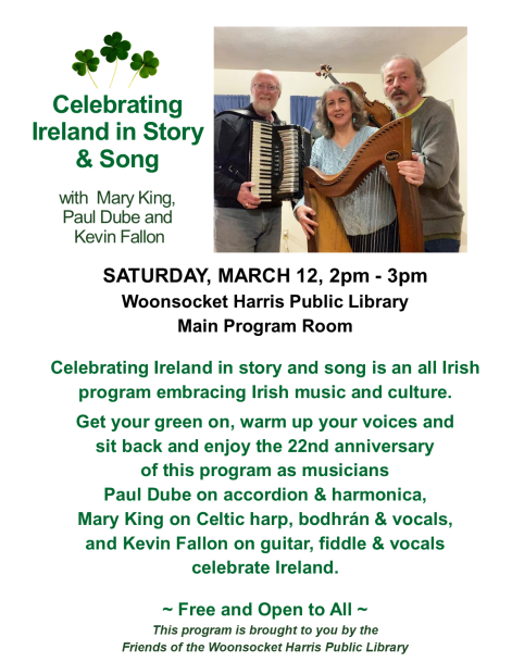 The Harris Public Library, 303 Clinton St. Woonsocket, will host Celebrating Ireland in Story and Song on Saturday, March 12 from 2pm-3pm in the main program room of the library. Celebrating Ireland in Story and Song is an all Irish program embracing Irish music and culture. Get your green on, warm up your voices and sit back and enjoy the 22nd anniversary of this program as musicians Paul Dube on accordion & harmonica, Mary King on Celtic harp, bodhrán & vocals, and Kevin Fallon on guitar, fiddle & vocals celebrate Ireland.