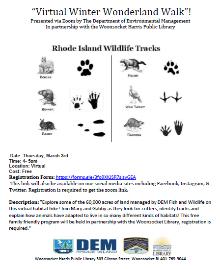 We have another wonderful opportunity to connect with our friends at RI Department of Environmental Management as they take us on a virtual winter wonderland walk exploring local wild animals and their habitats. Got a wild question about your local wilderness? You will be able to ask questions at the end of the presentation as this is on Zoom. You will need to fill out the DEM form below to get the code.