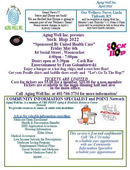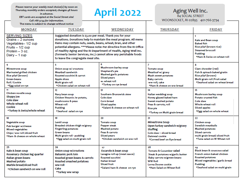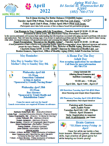 Aging Well Inc. April Activity, April Congregate Meal Menu and April Newsletter