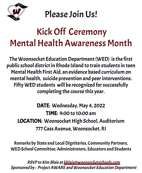 On Wednesday, May 4th from 9:00 to 10:00am, the Woonsocket Education Department will hold a Kick Off Ceremony for Mental Health Awareness Month.  This event will be held in the auditorium of the Woonsocket High School.