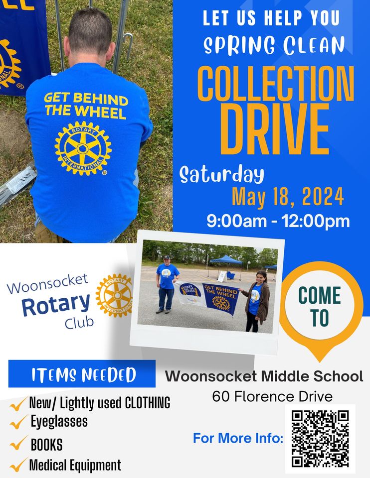 Here in Woonsocket, the Woonsocket Rotary club will perform their Day of Service by having a Collection Drive to be held at the Woonsocket Middle School at Hamlet, 60 Florence Drive from 9:00 AM to 12:00 PM. Woonsocket Rotary is asking that you please donate your clothing, books, eyeglasses, and medical equipment. No motorized scooters or wheelchairs please.